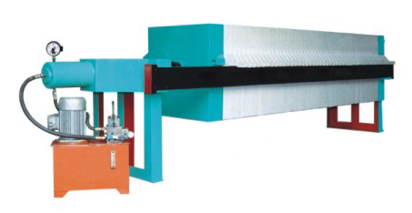 板框压滤机有手动压紧、机械压紧和液压压紧三种形式。手动压紧是螺旋千斤顶推动压紧板压紧;机械压紧是电动机配H型减速箱,经机架传动部件推动压紧板压紧;液压压紧是有液压站经机架上的液压缸部件推动压紧板压紧。两横梁把止推板和压紧装置连在一起构成机架,机架上压紧板与压紧装置饺接,在止推板和压紧板之间依次交替排列着滤板和滤框,滤板和滤框之间夹着过滤介质;压紧装置推动压紧板,将所有滤板和滤框压紧在机架中,达到额定压紧力后,即可进行过滤。悬浮液从止推板上的进料孔进入各滤室(滤框与相邻滤板构成滤室),固体颗粒被过滤介质截留在滤室内,滤液则透过介质,由出液孔排出机外。